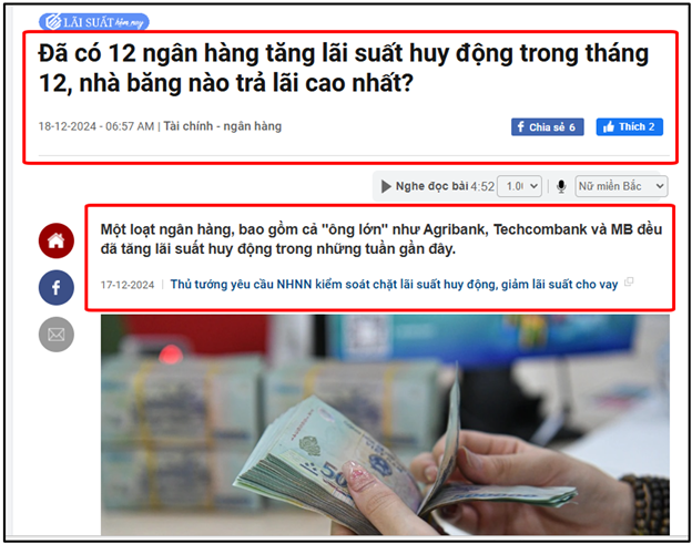 + Nhìn về lịch sử quá khứ, trong khoảng thời gian tháng 12/2024, các ngân hàng thương mại lẫn ngân hàng có vốn chủ sở hữu là nhà nước vẫn có động thái tăng lãi suất để huy động được nhiều, vì nhu cầu vay cuối năm cao.