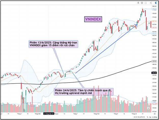 *Đây Không phải sự kiện "Thiên nga đen": Lịch sử cho thấy các cuộc đụng độ giữa Mỹ và Iran đã diễn ra nhiều lần trong những năm gần đây. Điển hình là sự kiện ngày 13/06/2025 (kéo dài 12 ngày): Thị trường Việt Nam khi đó phản ứng bằng một phiên giảm 15 điểm, sau đó rút chân tạo đáy và kéo vượt đỉnh. Đến khi hai bên đàm phán vào ngày 24/06, thị trường đã tăng giá mạnh mẽ và tâm lý lo ngại chiến tranh gần như biến mất.